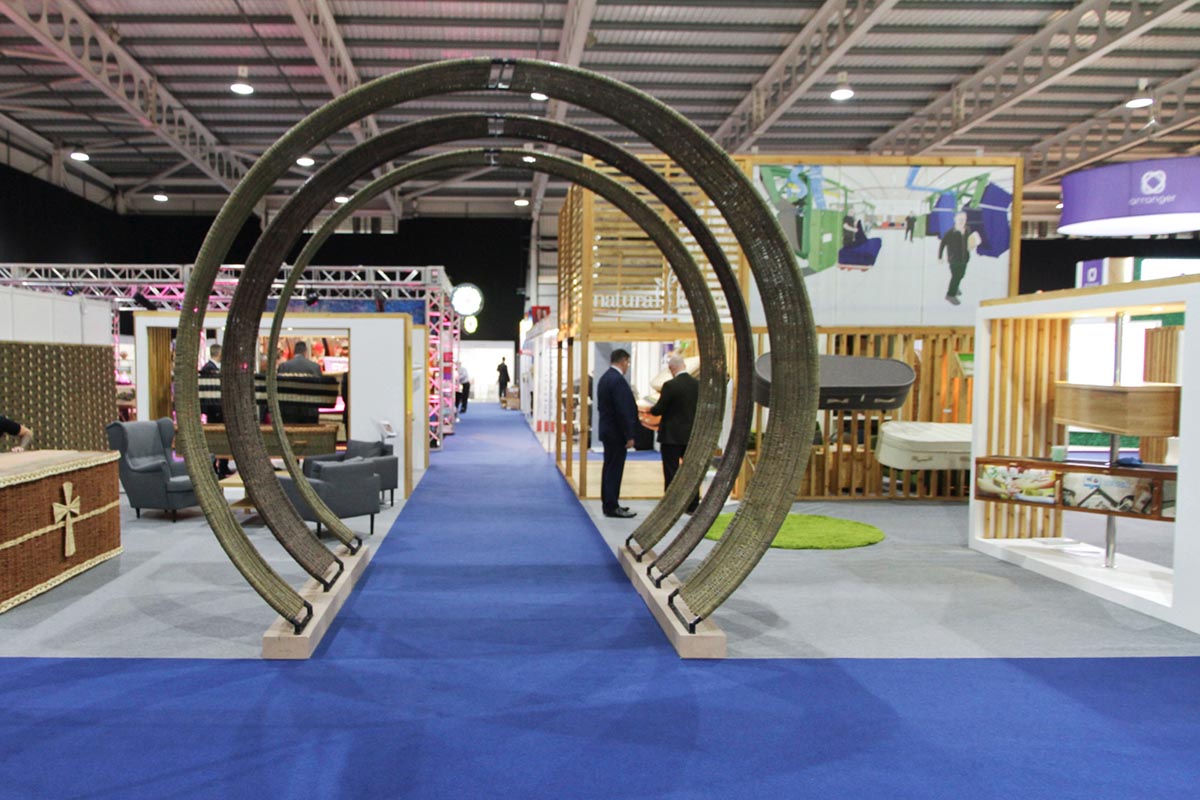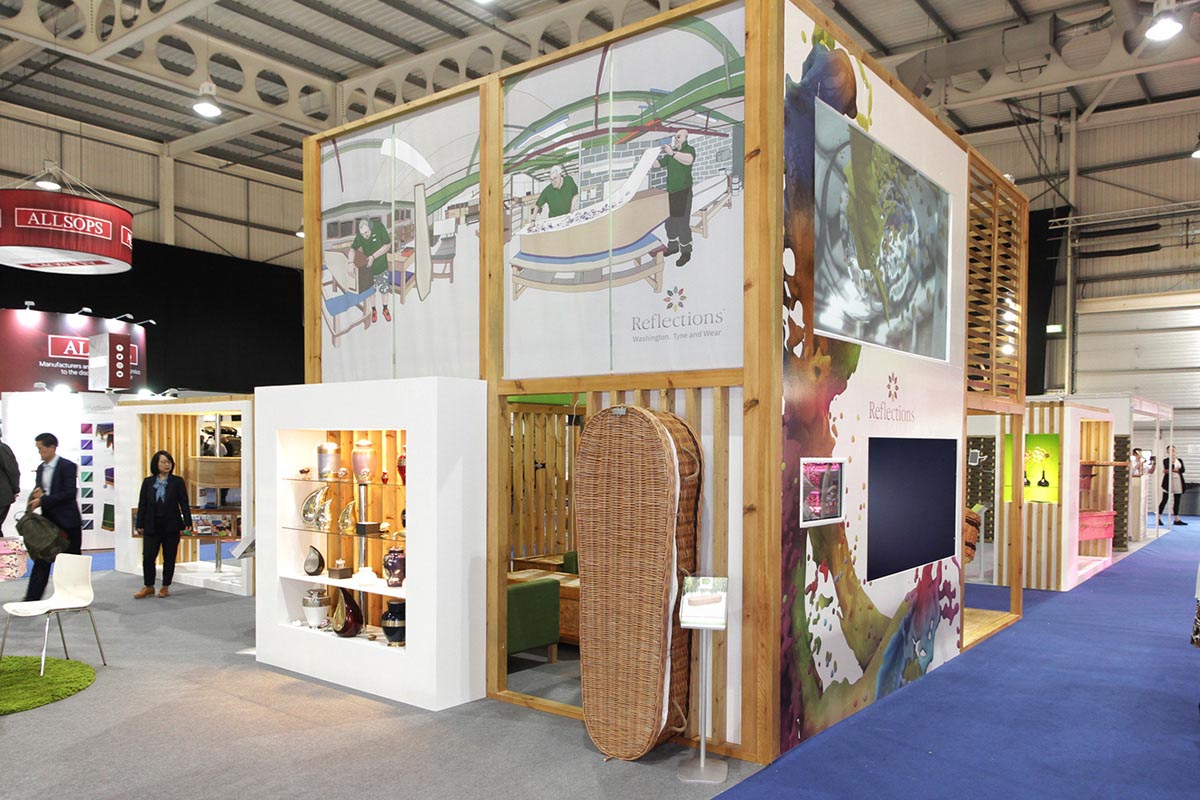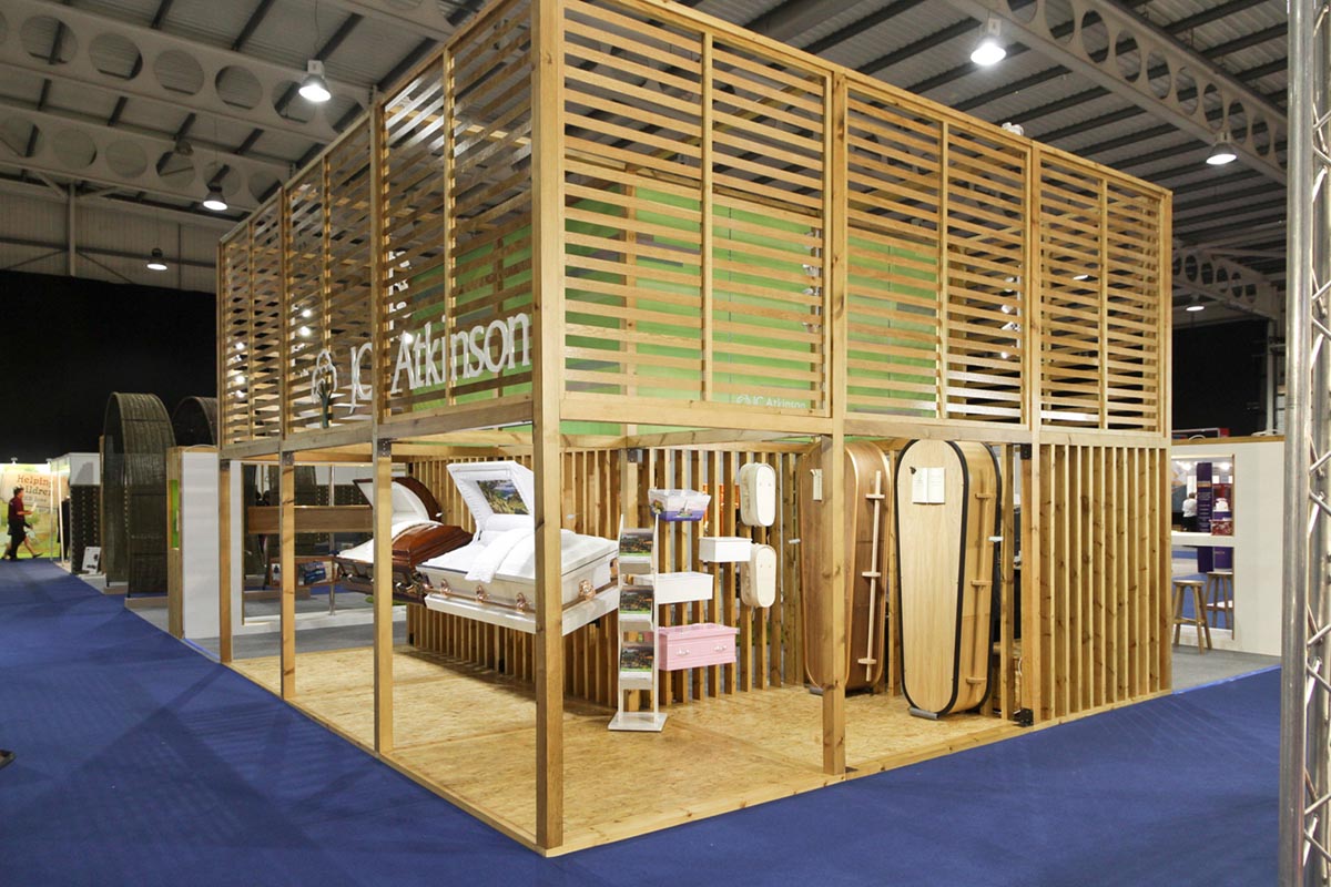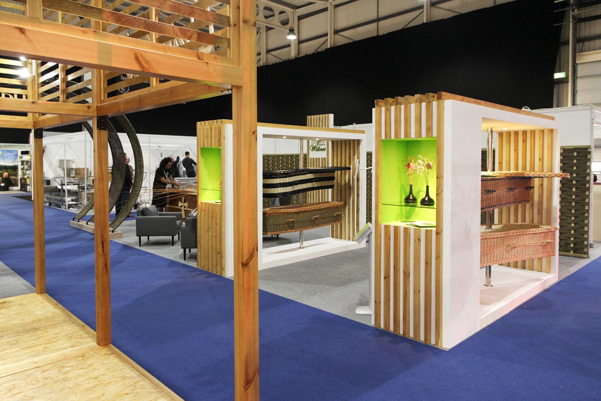 They said go big… so we did. 120 square meter exhibition stand combining the manufacturing capability of J C Atkinson and Musgrove Willow. Using the more modest exhibition stand created in 2017 as a starting point, additional structures and features were added to create a large, versatile space that hosted visitors in a relaxed, comfortable environment. Highlights included large format illustrations that mirrored 3D immersive factory tour videos, animated Reflections coffin display with video wall, and a modernist willow arch walkway with adjacent demonstration area.