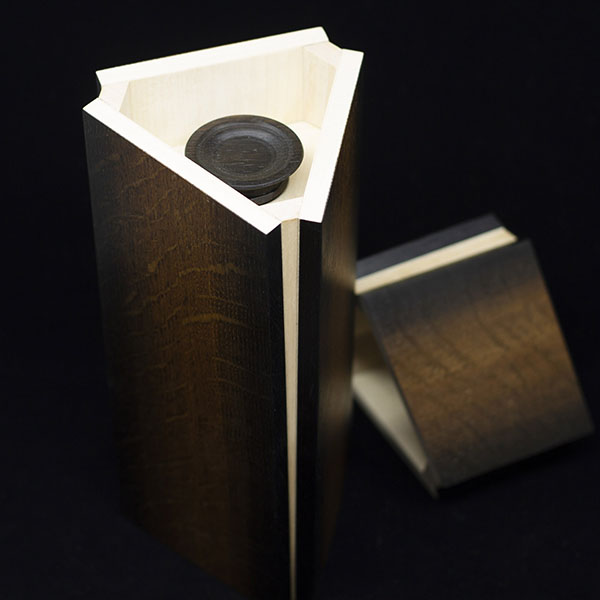 This was a personal project undertaken during my time at Robinson House Studio - a tapered ash casket designed for a much loved and missed pet. Using thin sycamore wedges to obtrude bog oak veneer sides, the triangular containers have asymmetrical angled lids that lift off to reveal a pale sycamore interior. The lower section is designed to safely contain the ashes and is sealed using a threaded bog oak threaded stopper. The top section is kept free to house keepsakes and mementos. Two caskets were made, one finished with a satin hardwax oil that retains the open grain of the oak, while the second uses a full gloss lacquer.