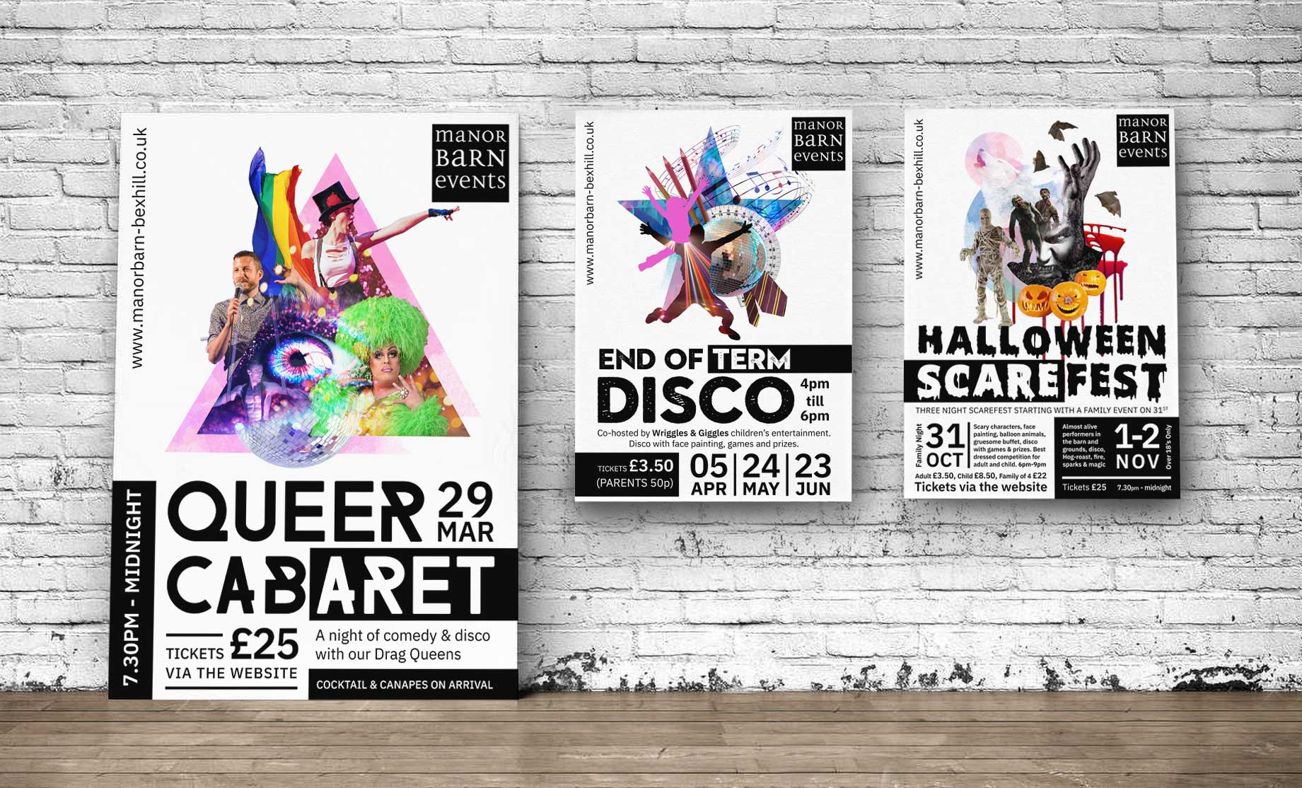 The Manor Barn is a hire and entertainment venue in East Sussex. Looking to expand their own events throughout 2019, they required posters and social media material for the different events. Rather than designing one off pieces of marketing, I suggested we develop a larger campaign that used a continuing style and theme to help boost brand recognition. The result was a long running series of promotional adverts that were delivered cross platform. Presented here a few of the event posters.