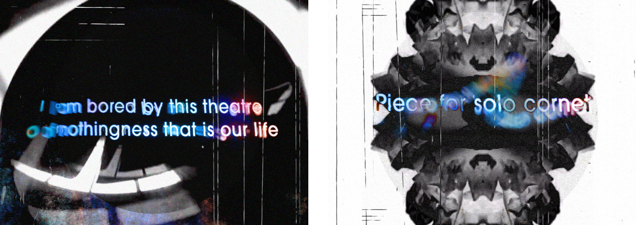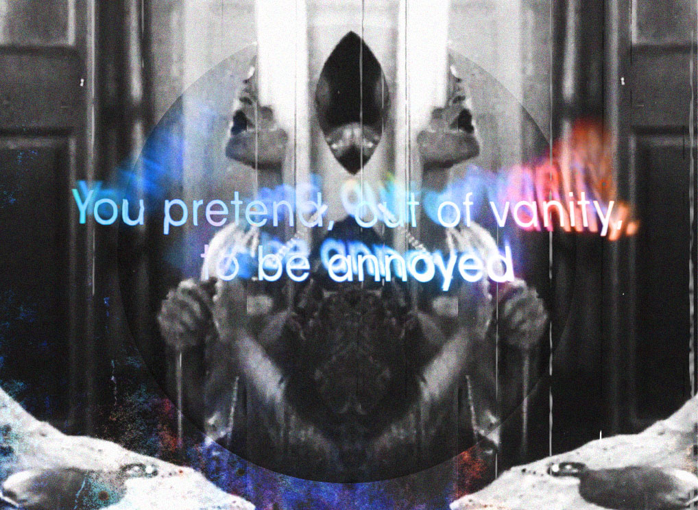 Inspiration for the supporting animation came from the experimental film work of René Clair, Jean Couteau and Man Ray. Splicing these sources together with found footage of Parisian life in a kaleidescopic treatment serves as a background for the recital song translations. These translation have been created digitally and then back projected on a screen and re-filmed through heavily warped perspex. This process produces a distortion that I hope captures the ephemeral excesses and later nilishm of the avante-garde during the interwar years.
